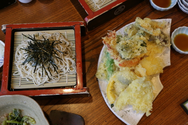 そばと来たら、天ぷら、そして日本酒でしょ! ということで天ぷらとざるそば、利き酒セット5種を注文。