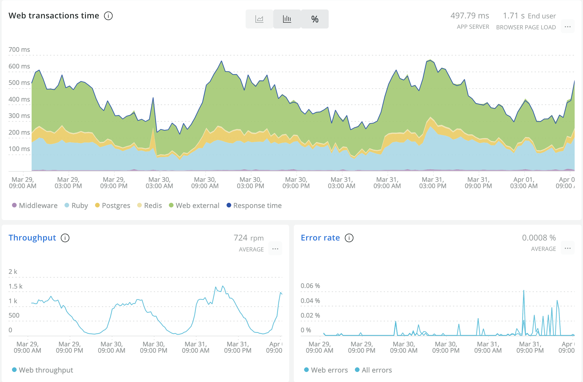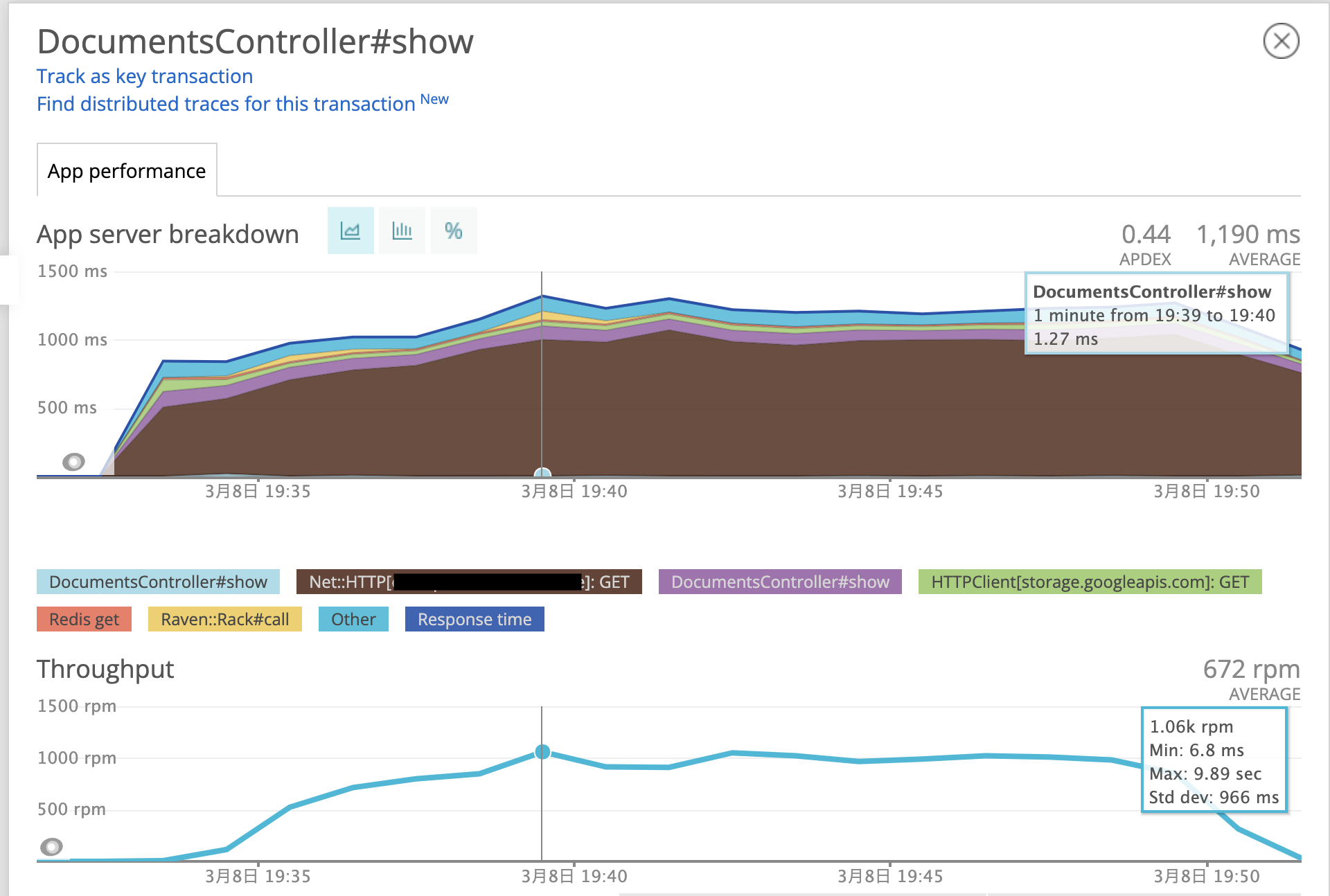 これはテストシナリオ中の「ユーザーが自分宛の書類を確認する」フェーズの状態です。 ある程度安定してリクエストを捌けており、最大で1060rpm(request per minute)を記録しています。 また、どの処理に時間がかかっているのかも視覚的にわかる(今回だと茶色い部分が多い)ので今後アプリケーションの性能を改善する際の参考にすることができます。