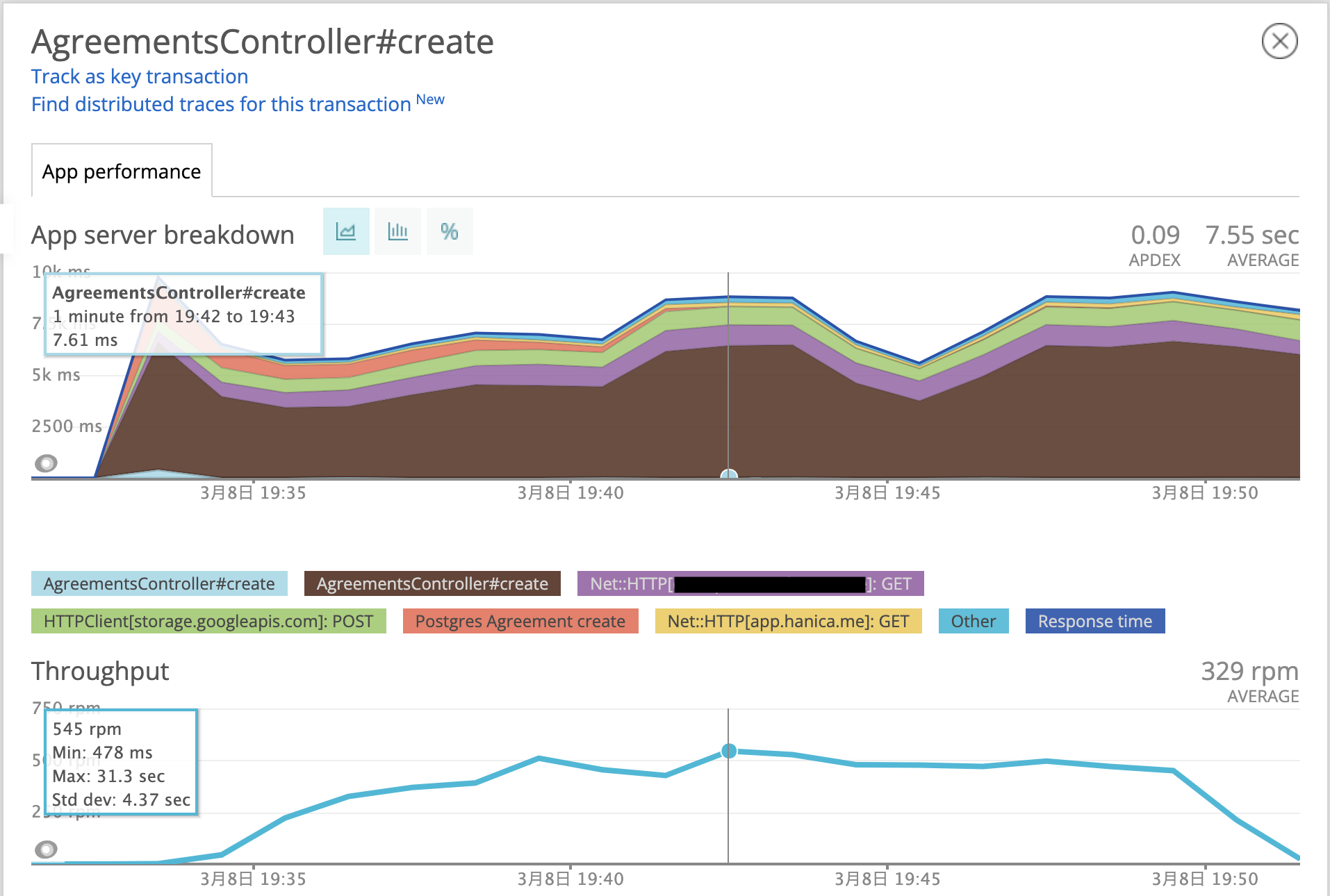 もう一つ、「書類に合意する」フェーズも見てみます。 書類の合意ではPDFファイルを生成したり、それに対して電子署名を付与したりなど重い処理が走るので、かなり値が悪くなって最大で545rpmでした。 また平均実行時間も7.55秒とだいぶかかっています。 結構遅いのでなんとかしたいのですが、今回はあくまで高負荷時にシステムが耐えられることを目標としていたので、別スコープとして考えることにしました