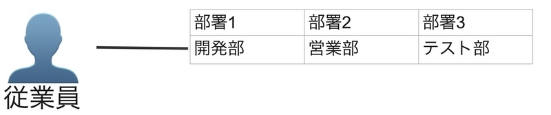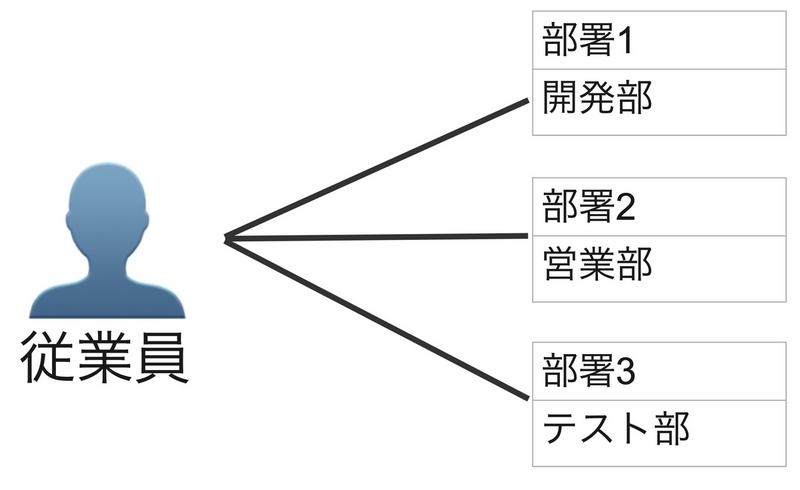 従業員は兼務の部署も管理できるように、データ構造としては以下のように1:nの関係でした。