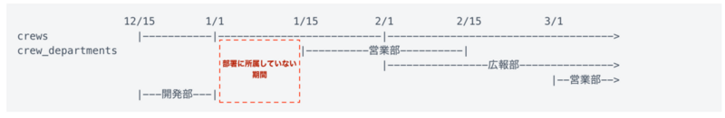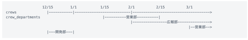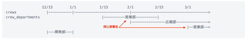 上記は1/1に従業員が作成されて、1/15に営業部に所属し、2/1に広報部を兼任、2/15に広報部専任になったものの、3/1からまた営業部の兼任になった従業員の履歴です。