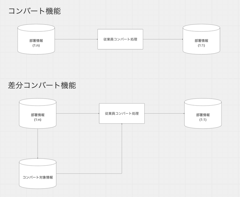 動いているサービスをできるだけ止めないまま、既存の1:nの部署情報を1:1に変換する必要があります。